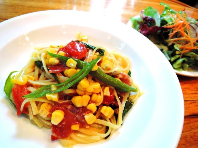 生ハムと甘長トウガラシ スイートコーンのリングイネ フレッシュトマトとオリーブオイル
