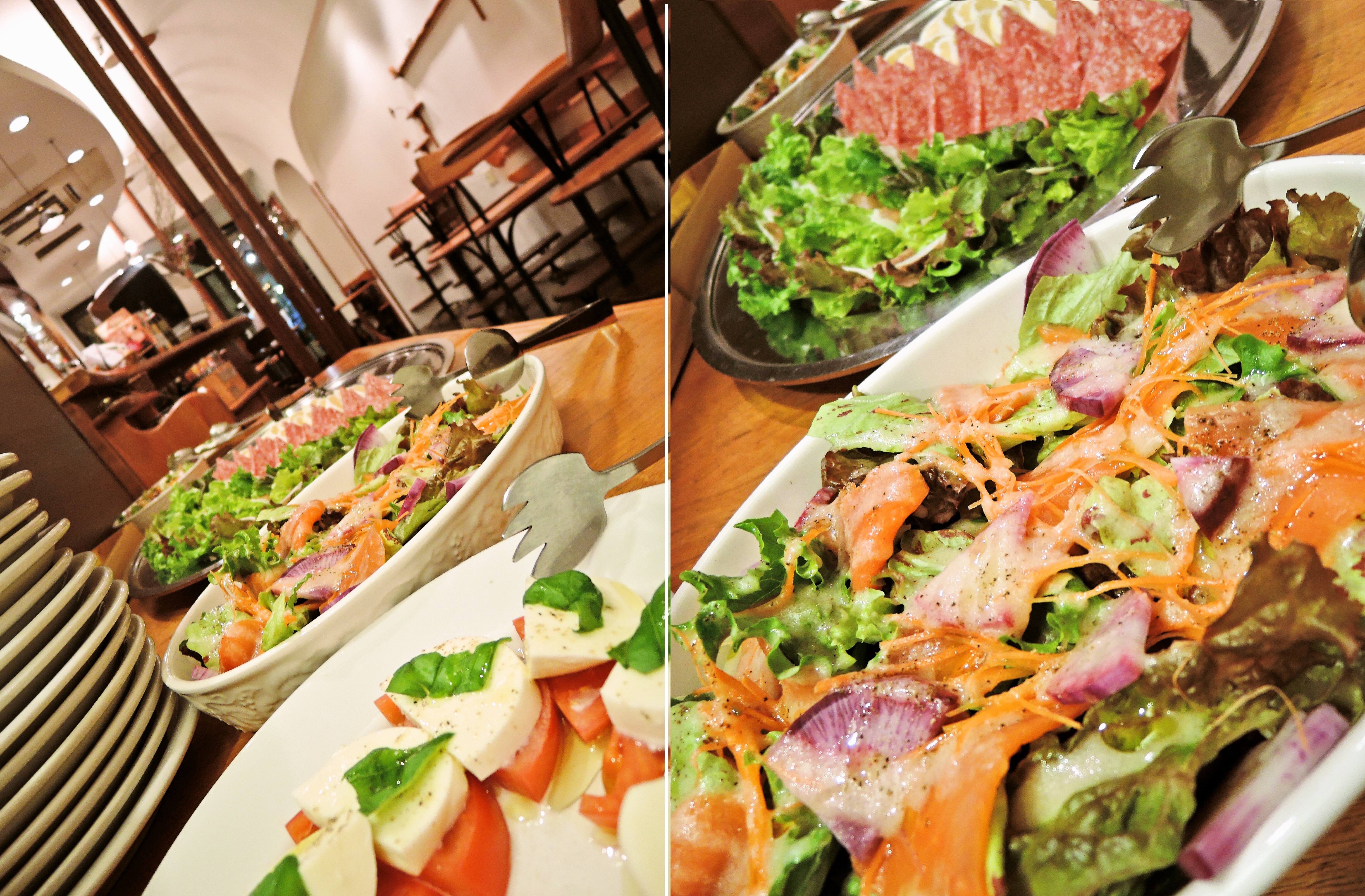 女性には嬉しい美容美肌の効果で評判のあるサーモンのサラダ。その色合いも鮮やかで、グリーンのレタスのなかにオレンジのように濃い色のサーモンが入って見た目もきれいです。そして手前のモッツァレラチーズ・カプレーゼ。緑、白、赤の色合いがイタリアの国旗を思わせます。