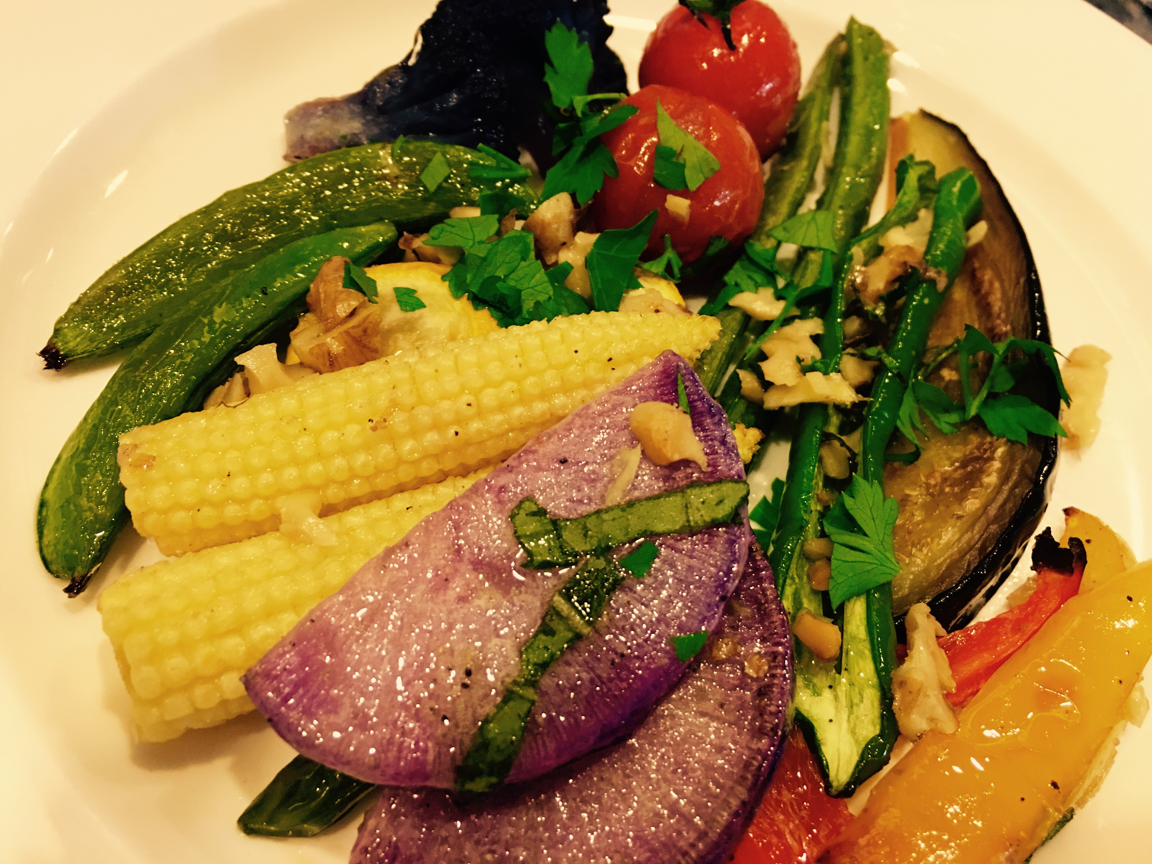 こちらもバーニャカウダ同様に珍しいお野菜が入っています。↑で言うならば、紫カリフラワー、紅しぐれ大根。紫色は前回お話した金時草と同じくアントシアニンが含まれたお野菜。老化防止、免疫力向上で夏バテ防止です!野菜それぞれの味わいを損ねず、味付けは塩・ミント・バジリコ・赤ワインビネガーそして、くるみだけ。もしかすると他ではあまりないお料理なのかもしれません。