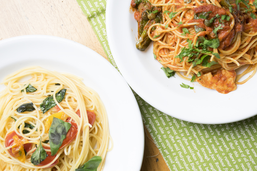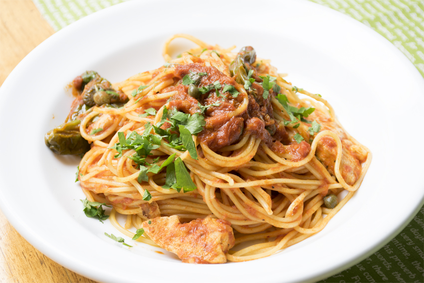 暑くてジメジメした日でも、カジキの旨味とトマト&ケッパーの酸味・そしてシシトウのピリリとくる辛さで、素材はヘルシーですがエナジーが回復できそうなエネルギッシュなパスタになっています!元気は出したいけど、カロリーは抑えたい方にとってもオススメなメニューです♪