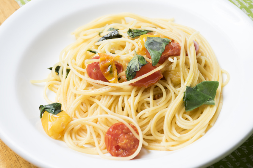 今回のペペロンチーノはアイコトマトが主役のヘルシーメニューです!アイコトマトとは小さな見た目に想像できないような贅沢な味わいを持つミニトマトです。果肉がぎっしりと詰まっていて、酸味や中のゼリーは控えめ…そして一番の特徴はフルーツのような甘み!時々花のような甘やかな香りを纏うトマトもあり、噛みしめるたびにその香りと甘味に癒やされます☆ 一緒に盛り付けられたバジルがその爽やかな香りでアイコトマトの華やかな甘みを引き立ててくれます♪