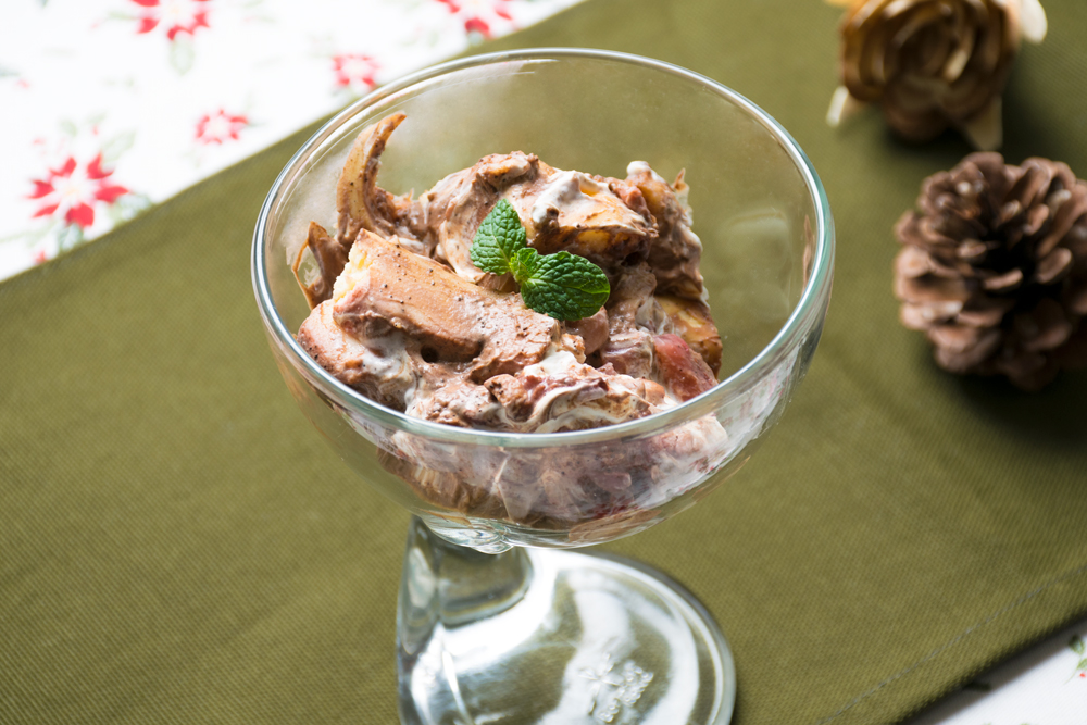 今回のドルチェは一口食べると不思議なことに、ここに入っていないフルーツやスイーツの存在まで感じる未体験な味わいです。コーヒーの香ばしい匂いとプディングの優しいカスタードの香り、そのあとにチョコの味わいが絶妙なハーモニーで、食べるごとにその印象が変わるので、飽きが来ません☆ 味わい控えめな甘さなのでいくらでもお口に運びたくなる、舌ざわりよし、香りふくよかな仕上がりです。