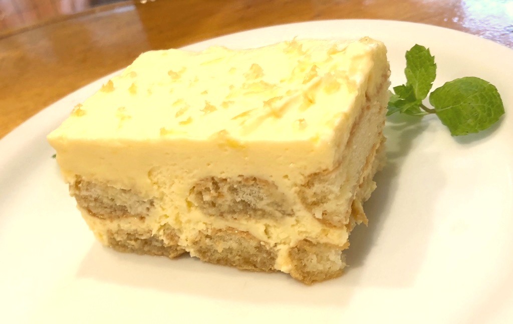 3品目は今月のドルチェ、昨年大好評だった「レモンと紅茶のティラミス」。今年のレモンティラミスは愛媛県の岩城島にある脇農園の「青いレモン」を使っています。皮ごと食べられるオーガニックのレモン。ちょっとよそとは違うティラミス。昨年からのお客様の熱いご要望にお応えして今年も復活しました!イタリアのビスケットにフィンガービスケットにアールグレイの紅茶を沁み込ませ、脇農園のレモンに果汁がたっぷり入ったレモン入りのマスカルポーネクリーム。柔らかい口あたりをぜひお楽しみください♪