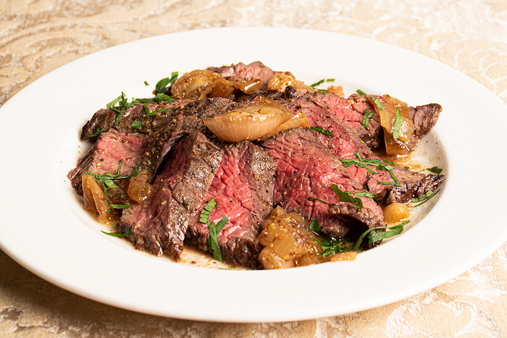 フラップミートとはカイノミと呼ばれる中バラの部分です。マスタード、エシャロット、マルサラ酒で作るほんのりと甘みのあるソースで。ボリュームたっぷり、食べ応えのあるメインです。