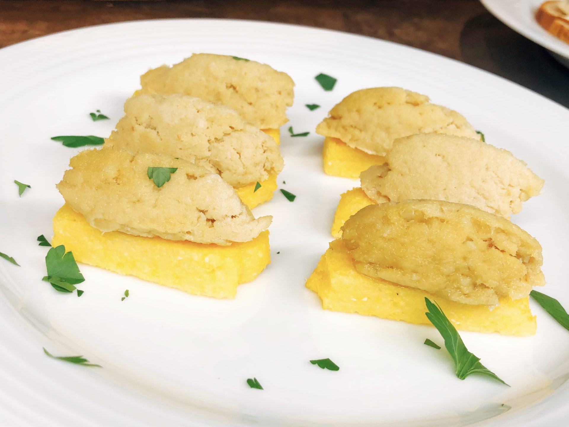 ポレンタはとうもろこしの粉で作ったイタリアではお粥のような、パンのような定番のお料理です。北イタリアの寒冷な山岳地帯では小麦の栽培が難しく、生産性の高いトウモロコシが使われたそうです。ふんわりもちっとした食感で、クセのない味わいです。北イタリアの人をポレントーネ( ポレンタを食べる人達)と呼ぶほど北イタリア、ベネト州では食べられています。