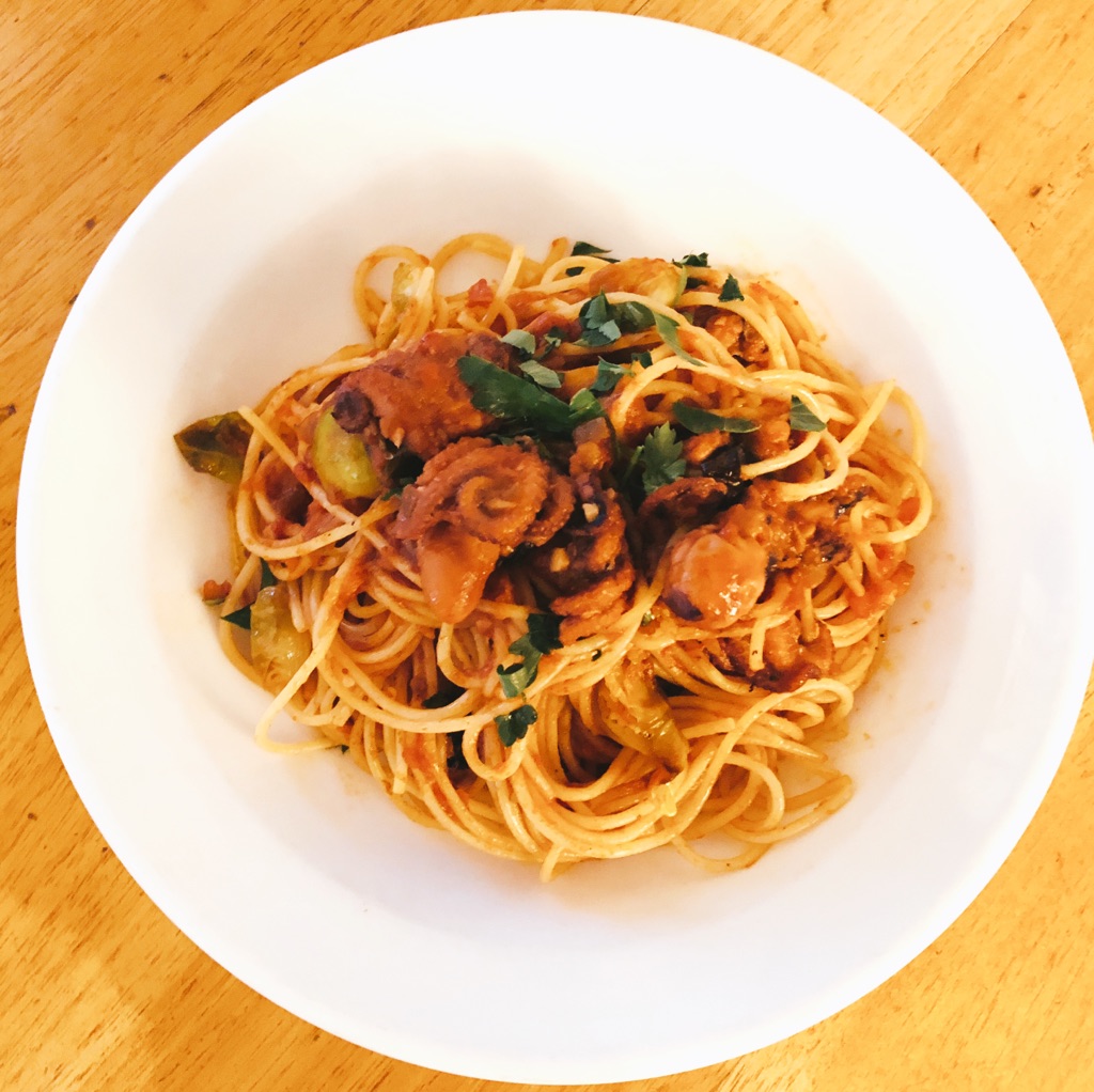 ○● イイダコとロースト芽キャベツのトマトソース スパゲッティ¥1,450●○